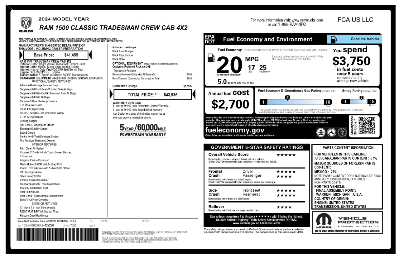 Vehicle Inquiry for 2024 RAM 1500 Classic Tradesman 4x2 Crew Cab 5'7" Box